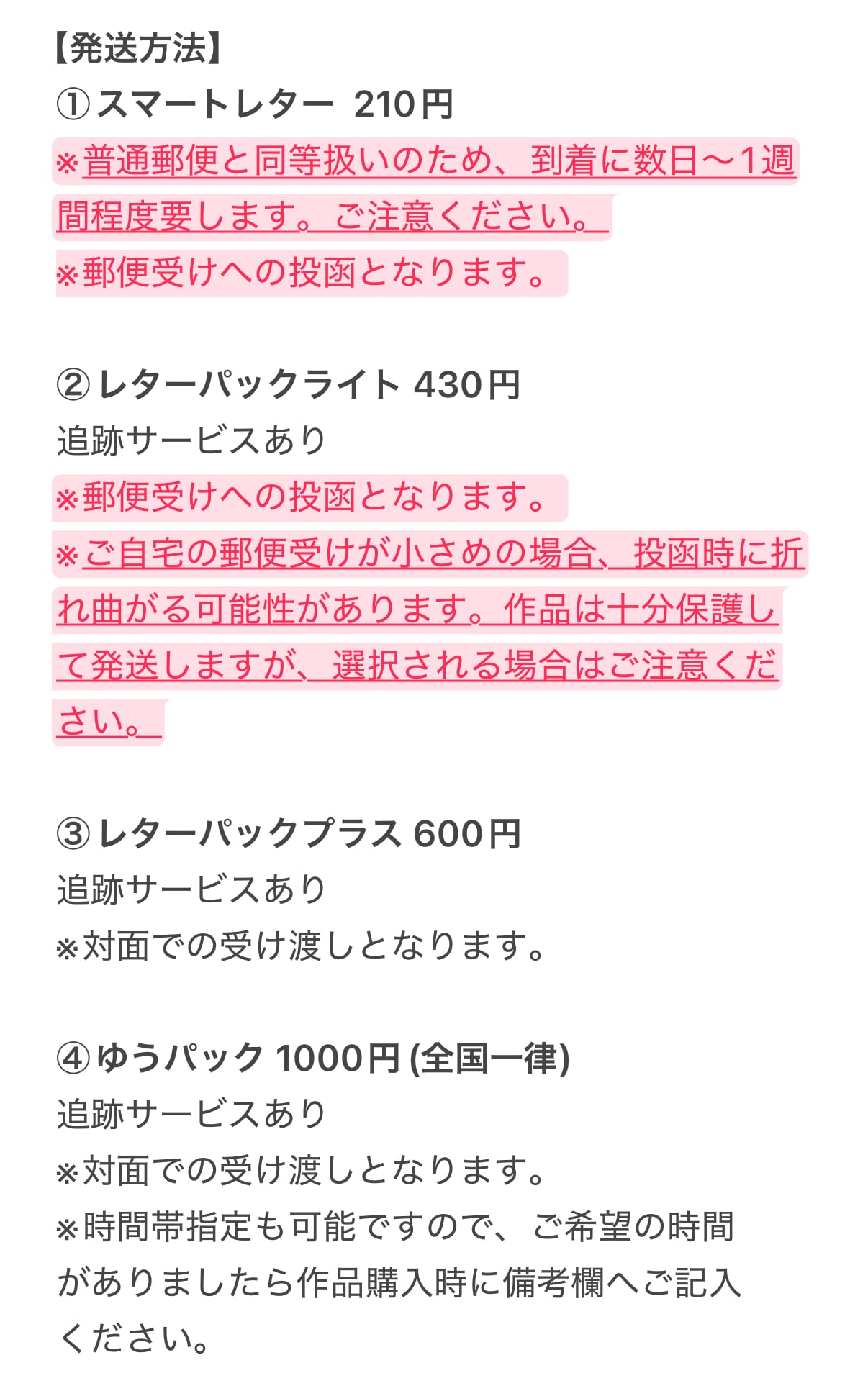 ※ご自宅の郵便受けが小さめの場合、投函時に折れ曲がる可能性があります。作品は十分保護して発送しますが、選択される場合はご注意ください。