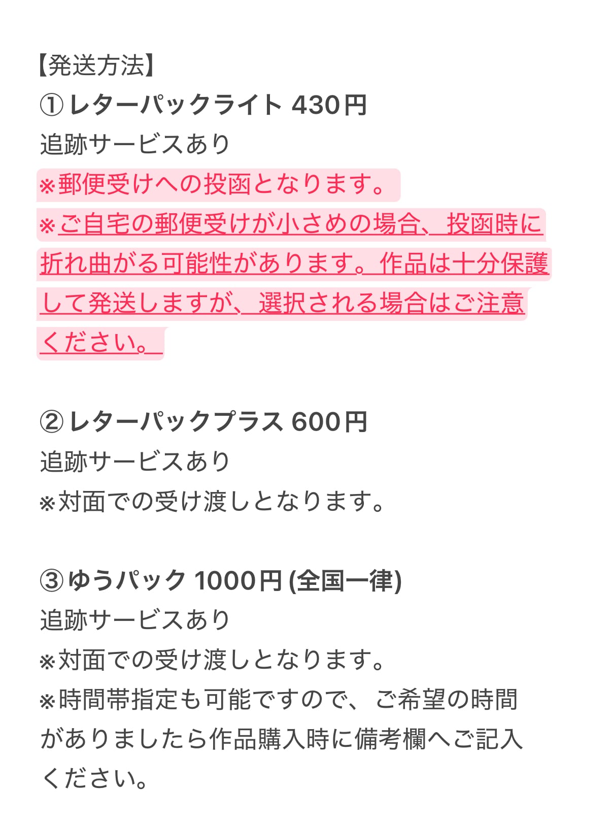 ※ご自宅の郵便受けが小さめの場合、投函時に折れ曲がる可能性があります。作品は十分保護して発送しますが、選択される場合はご注意ください。